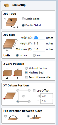 Define how you want to flip the material for double-sided projects from the Job Setup dialog. This influences the positioning of the vectors and models so that geometry on each side is created in the appropriate positions relative to the opposite side.