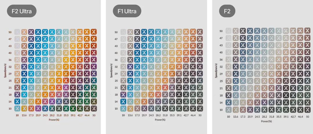 15 W:n diodilaser: paperi, puu, nahka, pinnoitettu metalli, jotkut tummat läpinäkymättömät akryylit jne. 5 W:n infrapunalaser: muovi, kulta, hopea, platina, ruostumaton teräs jne.